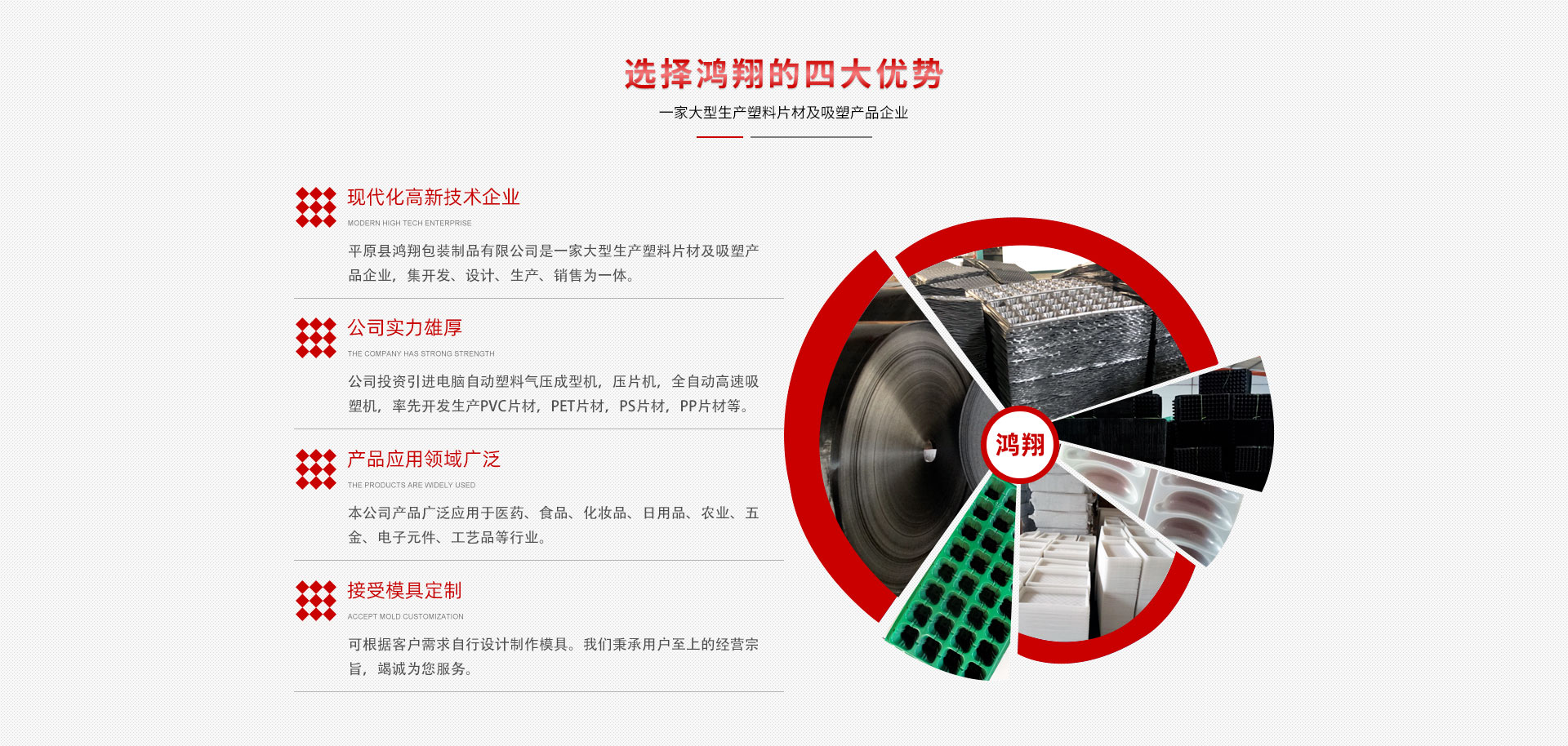 平原縣鴻翔包裝制品有限公司是一家大型生產(chǎn)塑料片材及吸塑產(chǎn)品企業(yè),本公司投資引進(jìn)電腦自動(dòng)塑料氣壓成型機(jī),壓片機(jī),全自動(dòng)高速吸塑機(jī),率先開發(fā)生產(chǎn)PVC片材,PET片材,PS片材,PP片材等,鴻翔是國(guó)內(nèi)先進(jìn)的生產(chǎn)廠家之一。本公司產(chǎn)品廣泛應(yīng)用于醫(yī)藥、食品、化妝品、日用品、農(nóng)業(yè)、五金、電子元件、工藝品等行業(yè),也可根據(jù)客戶需求自行設(shè)計(jì)制作模具。本公司技術(shù)力量雄厚,生產(chǎn)設(shè)備工藝先進(jìn)。我們秉承用戶至上的經(jīng)營(yíng)宗旨,竭誠(chéng)為您服務(wù)。